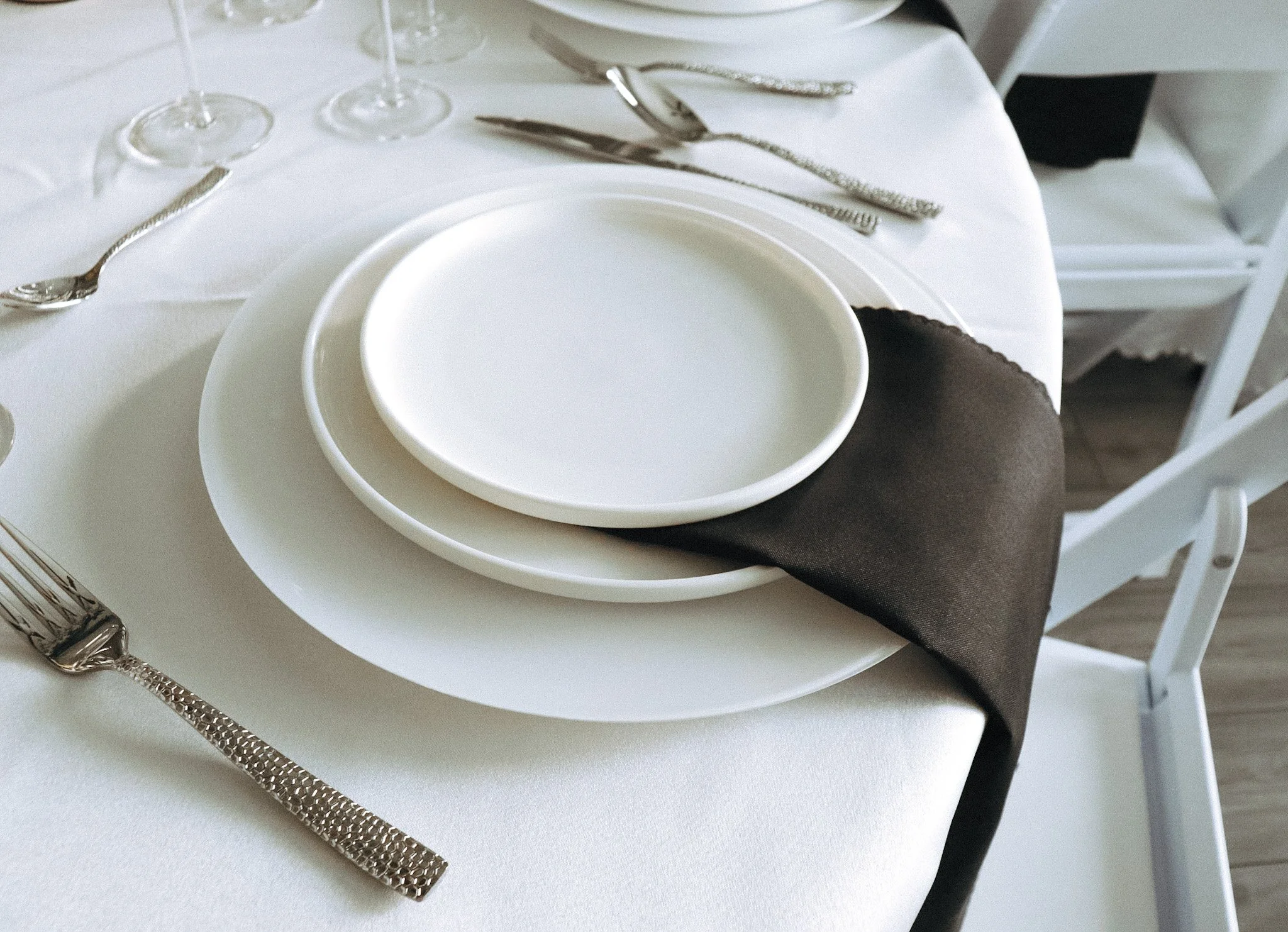 We offer two sizes of white ceramic plates, a set of four drink glasses, matte gold flatware, and textured silver flatware.
